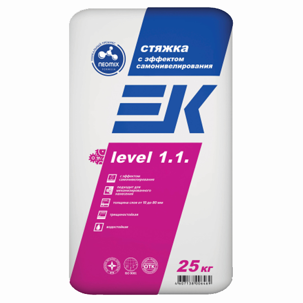 Смесь предназначена для предварительного выравнивания бетонных и цементно-песчаных оснований, имеющих неровности до 80 мм, с последующим выравниванием полученного покрытия водостойким быстротвердеющим наливным полом EK level 2.0., быстротвердеющим наливным полом ЕК level 2.1. или финишным наливным полом ЕК level 3.0.. Стяжка с эффектом самонивелирования EK level 1.1. также применяется под укладку керамической плитки, плит из натурального и искусственного камня, керамогранита. Смесь пригодна для использования в системе «теплый пол».