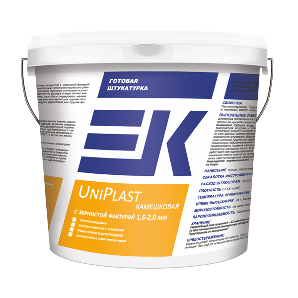 Готовая штукатурка EK UniPlast камешковая предназначена для изготовления декоративных тонкослойных покрытий с зернистой фактурой 1,5-2,0 мм для внутренних и наружных работ, в т.ч. при устройстве систем наружной теплоизоляции фасадов с применением пенополистирольного утеплителя. Штукатурка может наноситься на такие основания как бетон, традиционные цементно-песчаные и цементно-известковые штукатурки, гипсовые штукатурки и шпаклевки, древесностружечные, гипсокартонные и гипсоволокнистые плиты и т.д. Оштукатуренная поверхность имеет зернистую фактуру в виде плотно уложенной однородной по цвету мраморной крошки. Штукатурка образует прочное, эластичное и долговечное покрытие, способное перекрывать мелкие трещины (до 1 мм). Штукатурка отличается повышенной стойкостью к загрязнению, хорошей износостойкостью и поэтому рекомендуется для отделки стен вестибюлей, лестничных клеток и т.п. помещений. Благодаря высокой гидрофобности и низкому водопоглощению штукатурка эффективна для отделки фасадов зданий в регионах с частыми и интенсивными атмосферными осадками.