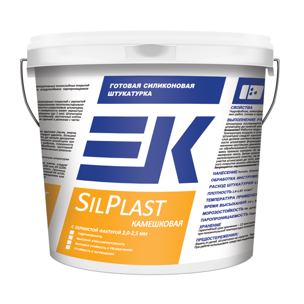 Готовая силиконовая штукатурка EK SilPlast камешковая предназначена для изготовления декоративных тонкослойных штукатурных покрытий с зернистой фактурой 2,0-2,5 мм для внутренних и наружных работ, в т.ч. при устройстве систем наружной теплоизоляции фасадов с применением пенополистирольного и минераловатного утеплителя. Штукатурка может наноситься на такие основания как бетон, цементно-песчаные и цементно-известковые штукатурки, гипсовые штукатурки и шпатлевки, древесностружечные, гипсокартонные и гипсоволокнистые плиты и т.д. Оштукатуренная поверхность имеет зернистую фактуру. Штукатурка образует прочное, эластичное и долговечное покрытие, способное перекрывать мелкие трещины (до 1 мм). Штукатурка отличается повышенной стойкостью к загрязнению, хорошей износостойкостью и поэтому рекомендуется для отделки стен вестибюлей, лестничных клеток и т.п. помещений. Благодаря высокой гидрофобности и низкому водопоглощению штукатурка эффективна для отделки фасадов зданий в регионах с частыми и интенсивными атмосферными осадками. Входит в систему утепления фасадов ЕК System PPS. Может использоваться в системе утепления фасадов ЕК System MW. Соответствует ГОСТ Р 55818-2013. “Составы декоративные штукатурные на полимерной основе для фасадных теплоизоляционных композиционных систем с наружными штукатурными слоями”. Может колероваться в цвета RAL и NCS.