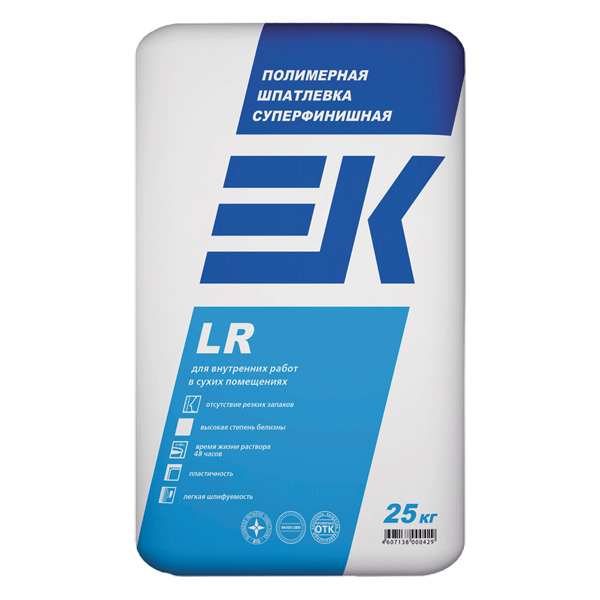 Полимерная шпатлевка суперфинишная EK LR предназначена для высококачественного выравнивания стен и потолков внутри сухих помещений, а также для заделки мельчайших дефектов основания. В качестве основания могут выступать бетон, оштукатуренные поверхности, ГКЛ, ГВЛ, пазогребневые плиты и другие виды минеральных поверхностей.