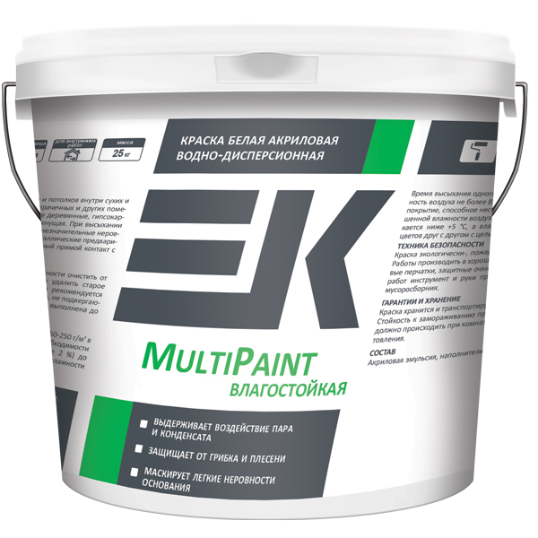 Влагостойкая водно-дисперсионная краска для стен и потолков предназначена для окрашивания стен и потолков внутри сухих и влажных жилых, подсобных и административных помещений (кухня, ванная комната и др.), а также прачечных и других помещений с повышенной влажностью. Наносится на бетонные, оштукатуренные, зашпаклеванные, а также деревянные, гипсокартонные, древесностружечные и древесноволокнистые основания внутри помещений. Краска быстросохнущая. При высыхании образует паропроницаемое, не препятствующее воздухообмену ровное матовое покрытие, скрывающее незначительные неровности основания, стойкое к шелушению и растрескиванию. Краска не горюча. Возможно нанесение на металлические предварительно загрунтованные основания. Не допускается применение на поверхностях, имеющих долговременный прямой контакт с водой.