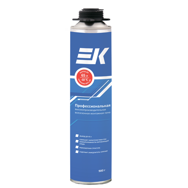 Профессиональная высокопроизводительная всесезонная монтажная пена предназначена для профессионального монтажа окон и дверей, заполнения пустот, щелей, герметизации стыков, тепло- и шумоизоляции, монтажа строительных конструкций. Предназначена для проведения работ в диапазоне температур от -10 до +35 °С. Выход пены до 65 л (зависит от температуры окружающей среды и влажности воздуха). Пена имеет хорошую адгезию ко всем материалам, за исключением фторопласта, полиэтилена и полипропилена. Поверхность пены высыхает через 10-15 минут. Пена полностью затвердевает в течение 24 часов (в шве шириной 30 мм и глубиной 60 мм). Затвердевшую пену можно резать, штукатурить, окрашивать. Термостойкость застывшей пены до +90 °С. Пена содержит замедлитель горения.