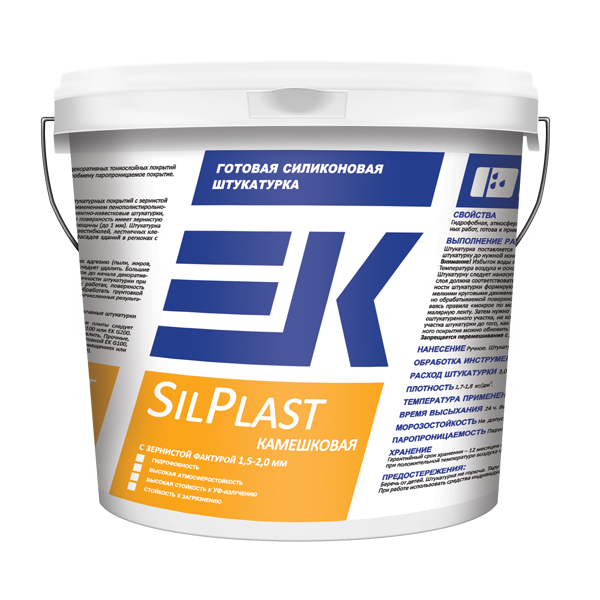 Готовая силиконовая штукатурка EK SilPlast камешковая предназначена для изготовления декоративных тонкослойных штукатурных покрытий с зернистой фактурой 1,5-2,0 мм для внутренних и наружных работ, в т.ч. при устройстве систем наружной теплоизоляции фасадов с применением пенополистирольного и минераловатного утеплителя. Штукатурка может наноситься на такие основания как бетон, цементно-песчаные и цементно-известковые штукатурки, гипсовые штукатурки и шпатлевки, древесностружечные, гипсокартонные и гипсоволокнистые плиты и т.д. Оштукатуренная поверхность имеет зернистую фактуру. Штукатурка образует прочное, эластичное и долговечное покрытие, способное перекрывать мелкие трещины (до 1 мм). Штукатурка отличается повышенной стойкостью к загрязнению, хорошей износостойкостью и поэтому рекомендуется для отделки стен вестибюлей, лестничных клеток и т.п. помещений. Благодаря высокой гидрофобности и низкому водопоглощению штукатурка эффективна для отделки фасадов зданий в регионах с частыми и интенсивными атмосферными осадками. Входит в систему утепления фасадов ЕК System PPS. Может использоваться в системе утепления фасадов ЕК System MW. Соответствует ГОСТ Р 55818-2013. “Составы декоративные штукатурные на полимерной основе для фасадных теплоизоляционных композиционных систем с наружными штукатурными слоями”. Может колероваться в цвета RAL и NCS.
