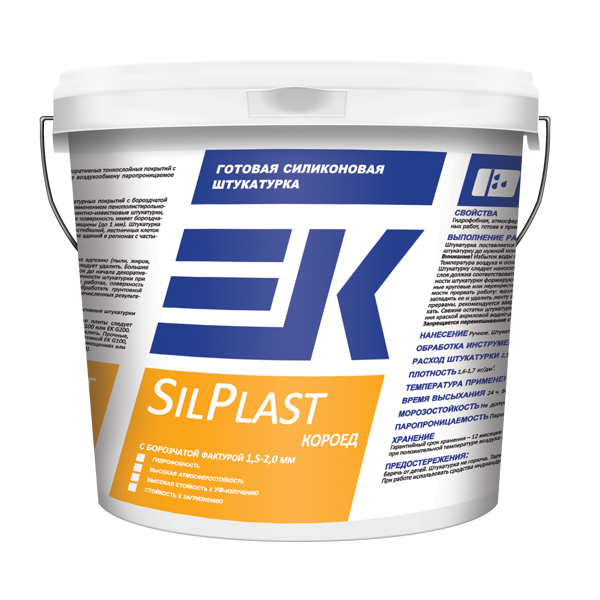 Готовая силиконовая штукатурка EK SilPlast короед предназначена для изготовления декоративных тонкослойных штукатурных покрытий с бороздчатой фактурой 1,5-2,0 мм для внутренних и наружных работ, в т.ч. при устройстве систем наружной теплоизоляции фасадов с применением пенополистирольного и минераловатного утеплителя. Штукатурка может наноситься на такие основания как бетон, цементно-песчаные и цементно-известковые штукатурки, гипсовые штукатурки и шпатлевки, древесностружечные, гипсокартонные и гипсо-волокнистые плиты и т.д. Оштукатуренная поверхность имеет бороздчатую фактуру короед. Штукатурка образует прочное, эластичное и долговечное покрытие, способное перекрывать мелкие трещины (до 1 мм). Штукатурка отличается повышенной стойкостью к загрязнению, хорошей износостойкостью и поэтому рекомендуется для отделки стен вестибюлей, лестничных клеток и т.п. помещений. Благодаря высокой гидрофобности и низкому водопоглощению штукатурка эффективна для отделки фасадов зданий в регионах с частыми и интенсивными атмосферными осадками.