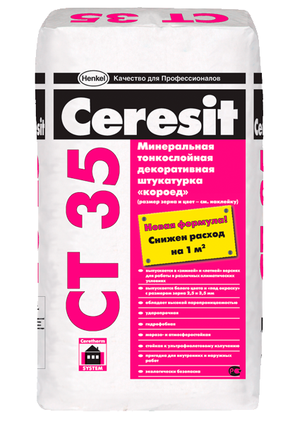 Тонкослойная смесь для штукатурных работ Ceresit CT 35 (Церезит CT 35) выпускается белого цвета или под окраску. Штукатурка имеет бороздчатую структуру и размеры зерен, составляющие 2,5 и 3,5мм.