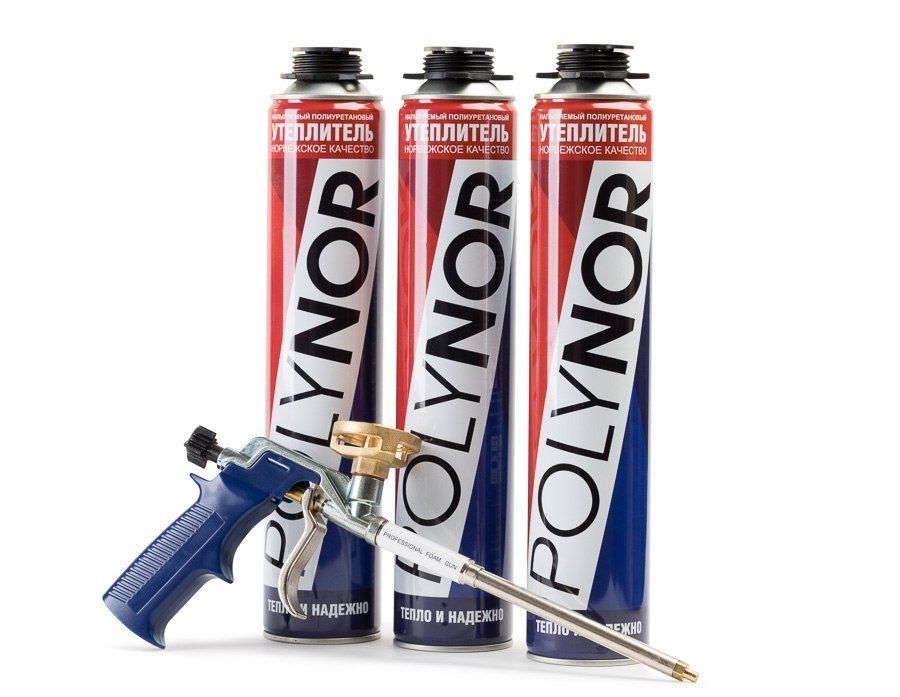 Утеплитель Полинор продаётся в баллонах по 890 мл. Наносится при использовании пистолета для монтажной пены и специальной насадки.