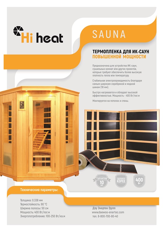 Термопленка высокой мощности HI HEAT Sauna, 400 Вт/м² - нагревательная пленка из специального углеродного волокна для ИК-саун, сушилок и очень холодных помещений.